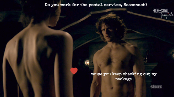 In the book world this would be like slogging through five thousand pages and not having the protagonists kiss until the last paragraph. That’s fine in the Pride and Prejudice world but not in our world. We wanted Jamie and Claire to be doing it by the end of the pilot. Preferably by the end of act 1 of the pilot. We’re impatient like that.