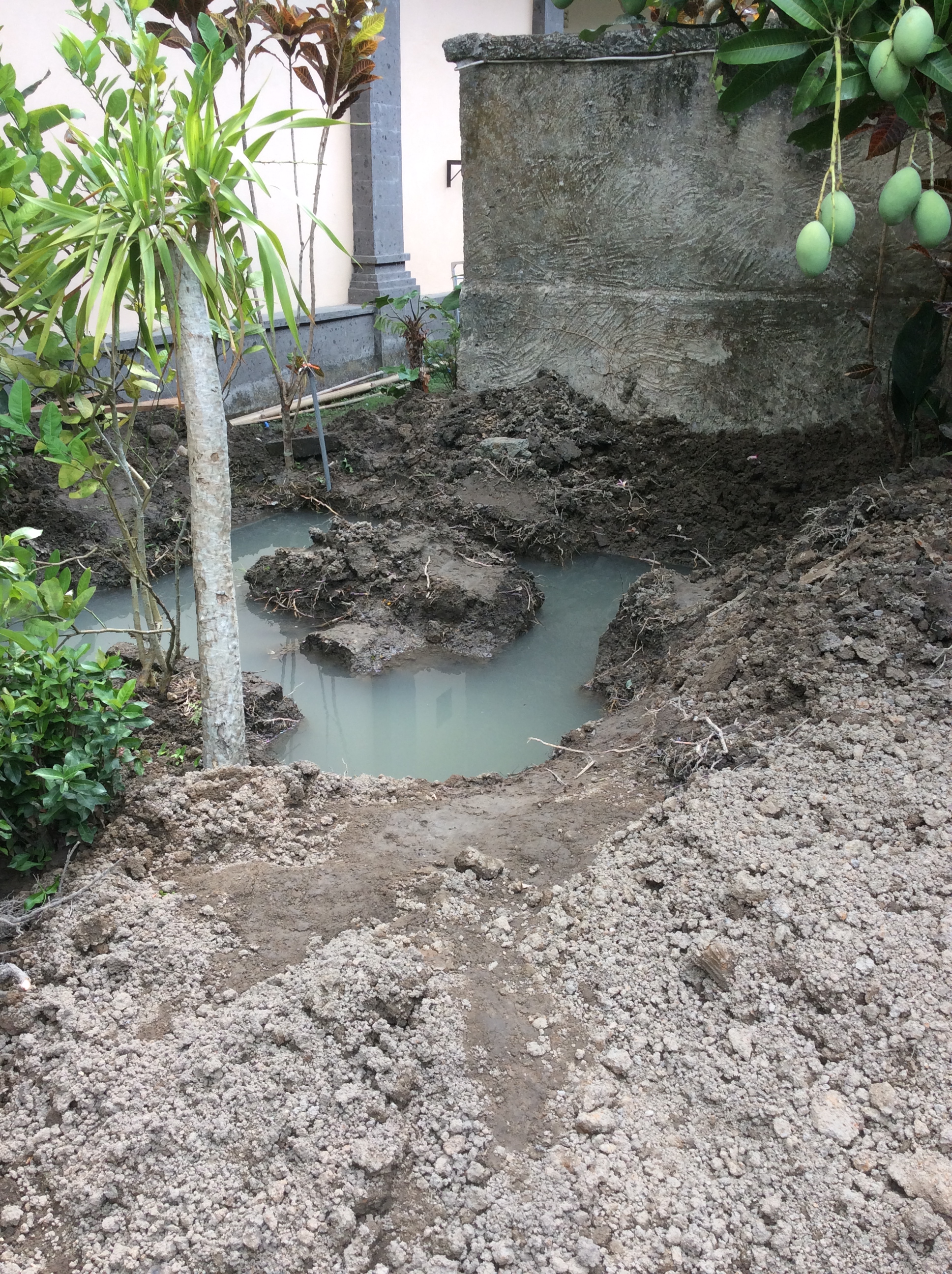 The men have come to erect the water tower. Two weeks later and we have no water tower but we do have this shallow hole filled with water in what was once our pretty back garden.